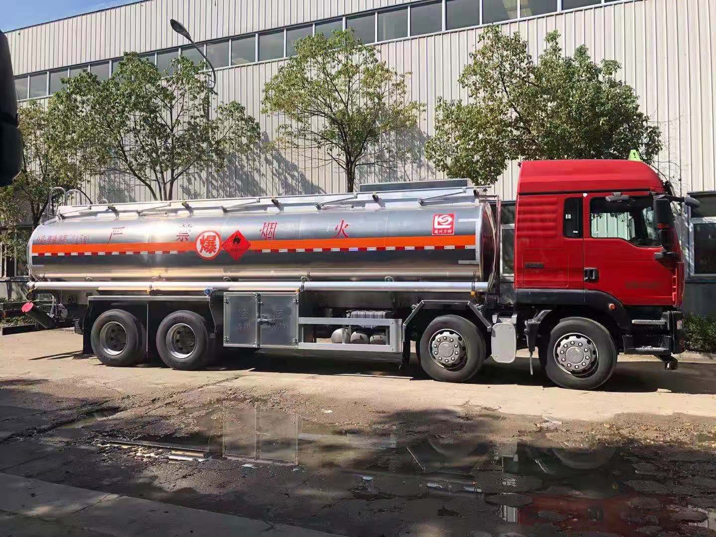上裝配置:上裝采用國標5083鋁合金板材,公告容積25.1(實際有效容積約26.5立方,滿載柴油約22噸),標配單倉,帶泵進泵出,標配兩個歐標罐蓋和緊急切斷閥,帶歐標全套下裝油系統(tǒng)(含下裝卸油閥、防溢流裝置和油氣回收裝置等),罐體頂部兩側(cè)帶折疊式升降防護欄,隨車配送兩根卸料軟管、陰陽端接頭、下裝油口轉(zhuǎn)換接頭等,其余均為廠家標配。罐體油漆為銀粉色金屬漆,兩側(cè)及后封頭水平正中貼3M-1級橙色反光帶,反光板,貼“易燃液體”標識,貼安全告示牌。